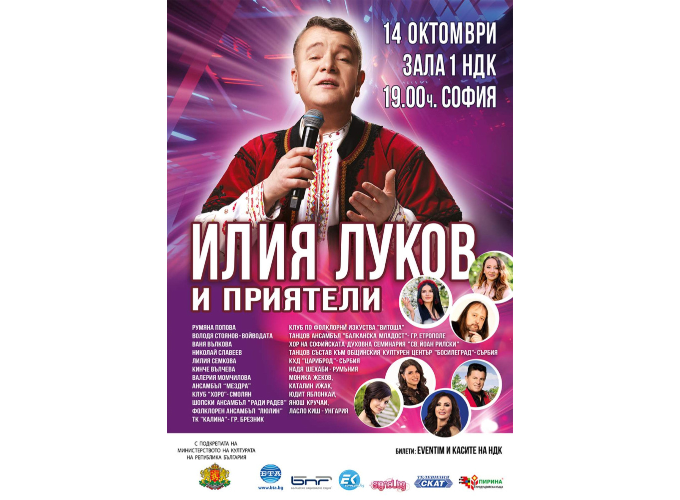 Продуцентска къща „Пирина“ Ви кани на концерта „Илия Луков и приятели“ в Зала 1 на НДК на 14.10.2025 г. от 19.00 ч. Вдъхновени от патриотичните стихове на Дамян Дамянов: “ Българио, чиста те взех и пак чиста те давам на моя далечен прадядо на моя далечен правнук!“, ние, участниците в концерта, ще изпълним в автентичен вид българския фолклор, който сме получили от нашите прадеди, за да го оставим в наследство на нашите правнуци.